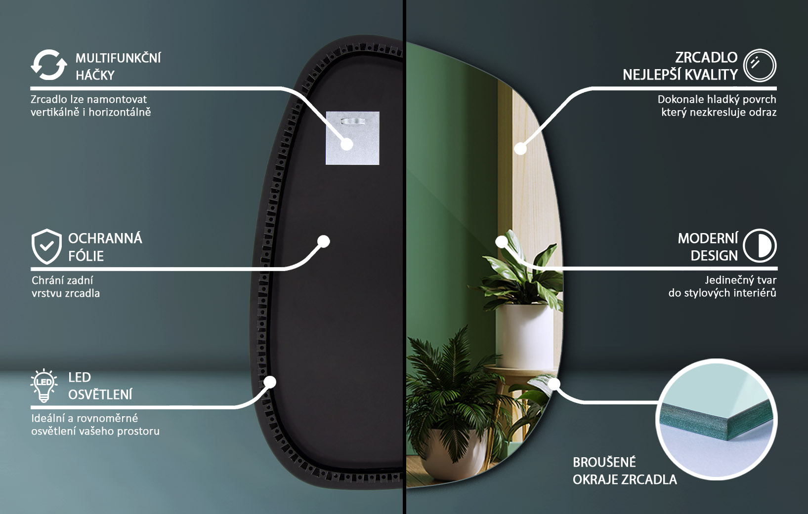 Exkluzivní LED zrcadlo s jemnými liniemi je designový klenot, který okamžitě upoutá pozornost. Jeho nepravidelný, organický tvar připomínající elegantní skvrnu vnáší do prostoru originalitu a moderní nádech. Jemné podsvícení LED světlem zvýrazní křivky zrcadla a vytvoří atmosféru, která dodá vaší místnosti útulnost i luxusní vzhled.