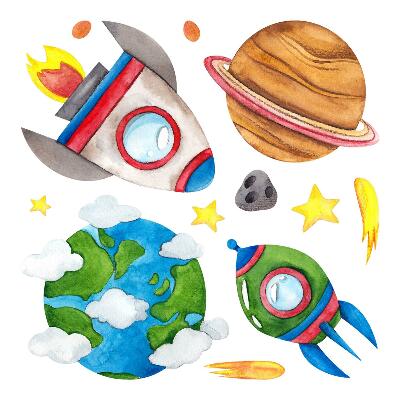 Samolepka na zeď 130x220 Vesmírný akvarel s raketami a hvězdami